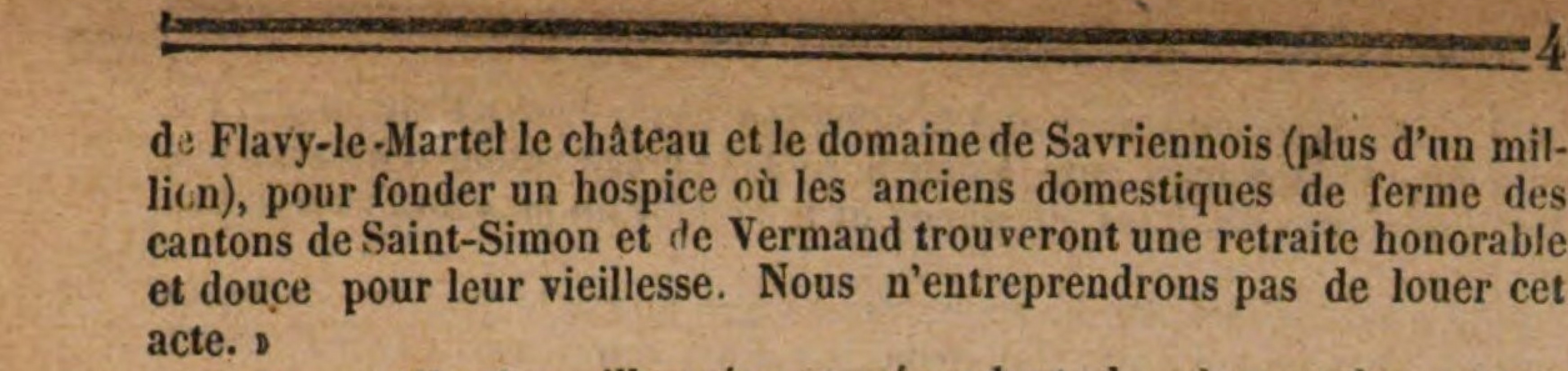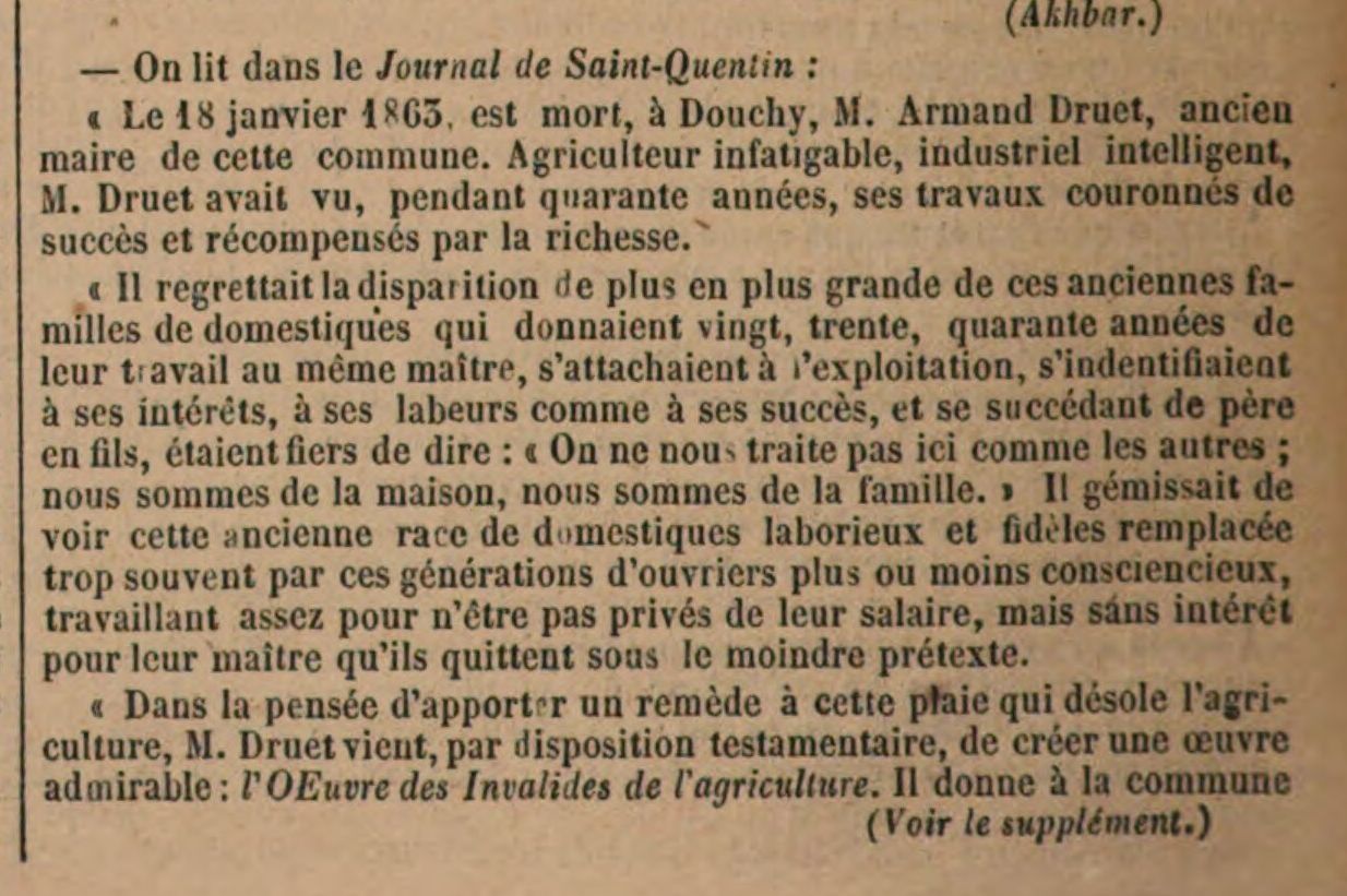 M. DRUET-.MARTINE, de Douchy. extrait des décisions du Comice Agricole 1863 Le» membres du Comice de Saint-Quentin n'ont pas appris sans um vif intérêt que M. Druet-'Martine, ancien cultivateur, demeurant à Douchy, membre du Comice , avait affecté , par dispositions testamentaires, tout le domaine de Savriennois à la fondation d'un hospice destiné à recevoir les vieux serviteurs de l'agriculture des cantons de Saint-Simon et de Vermand. En attendant de plus amples détails sur celte généreuse fondation, nous empruntons au Journal de Saint-Quentin du 28 janvier 1863 la note suivante, qui la fait connaître : ce Le 18 janvier 1863, est mort, à Douchy, M. Armand Druet, ancien maire de cette commune. Agriculteur infatigable, industriel intelligent, M. Druet avait eu, pendant quarante années, ses travaux couronnés de succès et récompensé par la richesse. Vers 1854 il remettait à un fils, digne de lui, la direction de son exploitation agricole et de son importante usine ; il semblait que pendant de longs jours, il devait être l'heureux témoin de la prospérité de son flls, si bien préparé à continuer les traditions paternelles, mais Dieu en avait autrement disposé, et ce fils, objet de tant d'affection et d'espérance, tombait frappé dans la force de sa jeunesse. Depuis la mort prématurée de son fils unique, M. Druet, privé d'héritier direct, avait conçu la touchante pensée, et recherché les moyens d'appeler à sa succession la seconde famille du cultivateur, les domestiques de ferme. Il avait bien souvent déploré la situation pénible que l'égoisme et l'espoir d'indépendance créent tous les jours entre le maître et le serviteur : il regrettait la disparution de plus en plus grande de ces anciennes familles de domestiques qui donnaient vingt, trente, quarante années de leur travail au même maître, s'attachaient à l'exploitation, s'identifiaient à ses intérêts, à ses labeurs comme à ses succès, et se succédant de père en fils, étaient fiers de dire : on ne nous traite pas ici comme les autres, nous sommes de la maison, nous sommes de la famille. Il gémissait de voir cette ancienne race de domestiques laboureurs et fidèles remplacée trop souvent par ces générations d'ouvriers plus ou moins conseienscieux, travaillant assez pour n être pas privés de leurs salaires, mais sans intérêt pour leur maître qu'ils quittent sous le moindre prétexte. » Dans la pensée d'apporter un remède à cette plaie qui désole l'agriculture, M Druet vient, par disposition testamentaire, de créer une œuvre admirable : l'œuvre des Invalides de l’ agriculture. Il donne à la commune de Flavy-le-Martel le château et le domaine de Savriennois (plus d'un million), pour fonder un hospice où les anciens domestiques de ferme des canton de Saint-Simon et de Vermand trouveront une retraite honorable et douce pour leur vieillesse. Nous n'entreprendrons pas de louer cet acte : d'autres donations de M. Druet feront longtemps bénir son nom par les pauvres de Douchy, de Bernes et de Flavy-le-Martel ; mais cette fondation éternisera sa mémoire. Ajoutons que la reconnaissance de la postérité atteindra sa digne épouse et toute sa famille. En effet, ces dispositions ont été faites du consentement de Mad. Druet, et les nombreux collatéraux ont tous applaudi à cette œuvre, sans regret pour l'héritage qu'elle leur enlève. » Dans le Moniteur belge de 1863